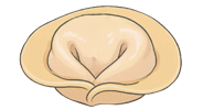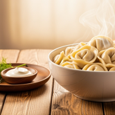 Dun deeg, vulling van kalfs- en varkensvlees, geserveerd met zure room en kruiden.